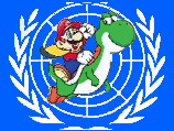 The LUEnited Nations flag was an image of a blue background with a mascot called LUEshi pasted on the front. LUEshi is the image of Mario riding Yoshi that is seen on the front of the box of Super Mario World for the SNES.