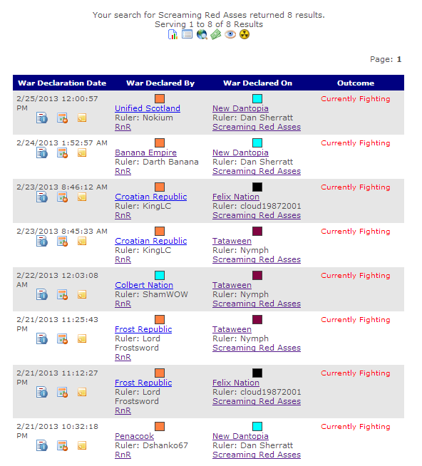 The night before that declaration, five members of Hooligans joined the Red Ass AA, bringing total membership to six (the previous high of SRA membership was two). After the Hooligans DoW, R&R began attacks on former Hooligan nations flying the Red Ass AA. Although there was no formal DoW by R&R, they acknowledged these attacks on the OWF in the Hooligans DoW thread, their president, EgoFreaky,stating "Oh by the way, you seemed to have misplaced a few nations.. Don't worry though, we found them for you :)".